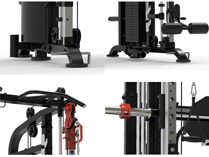 主要功能:飞鸟/站立高位下压、坐式高位下拉、杠铃杆左右转体及上推、单双杠、低拉杠铃杆站立提拉、杠铃杆肩扛蹲起、拳击训练、俯卧撑、引体向上,配合训练凳可做坐姿勾腿、仰卧勾腿、上斜/下斜/平卧推举功能、上肢前倾拉伸。